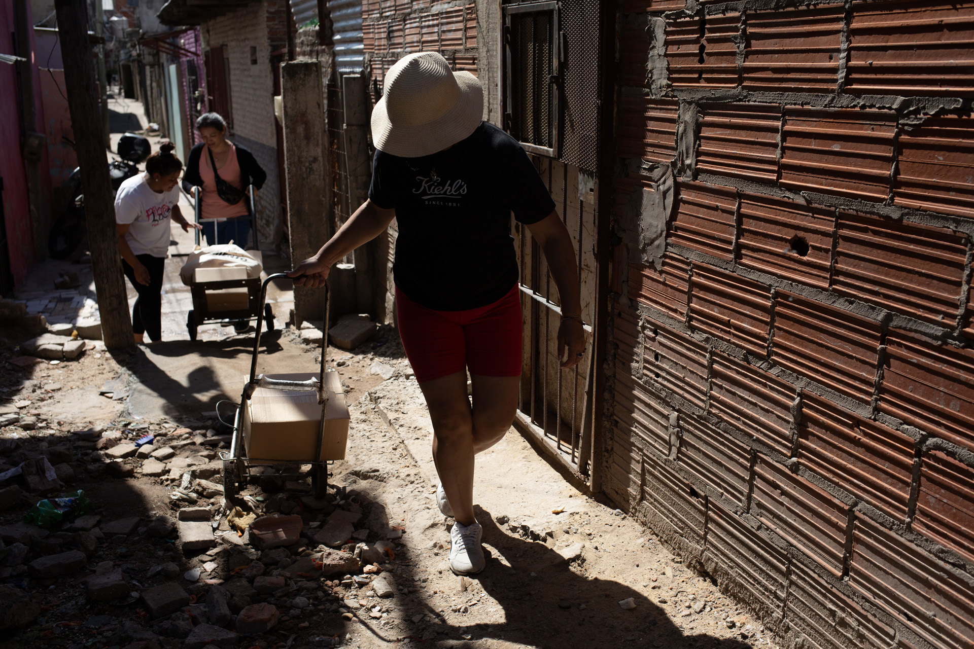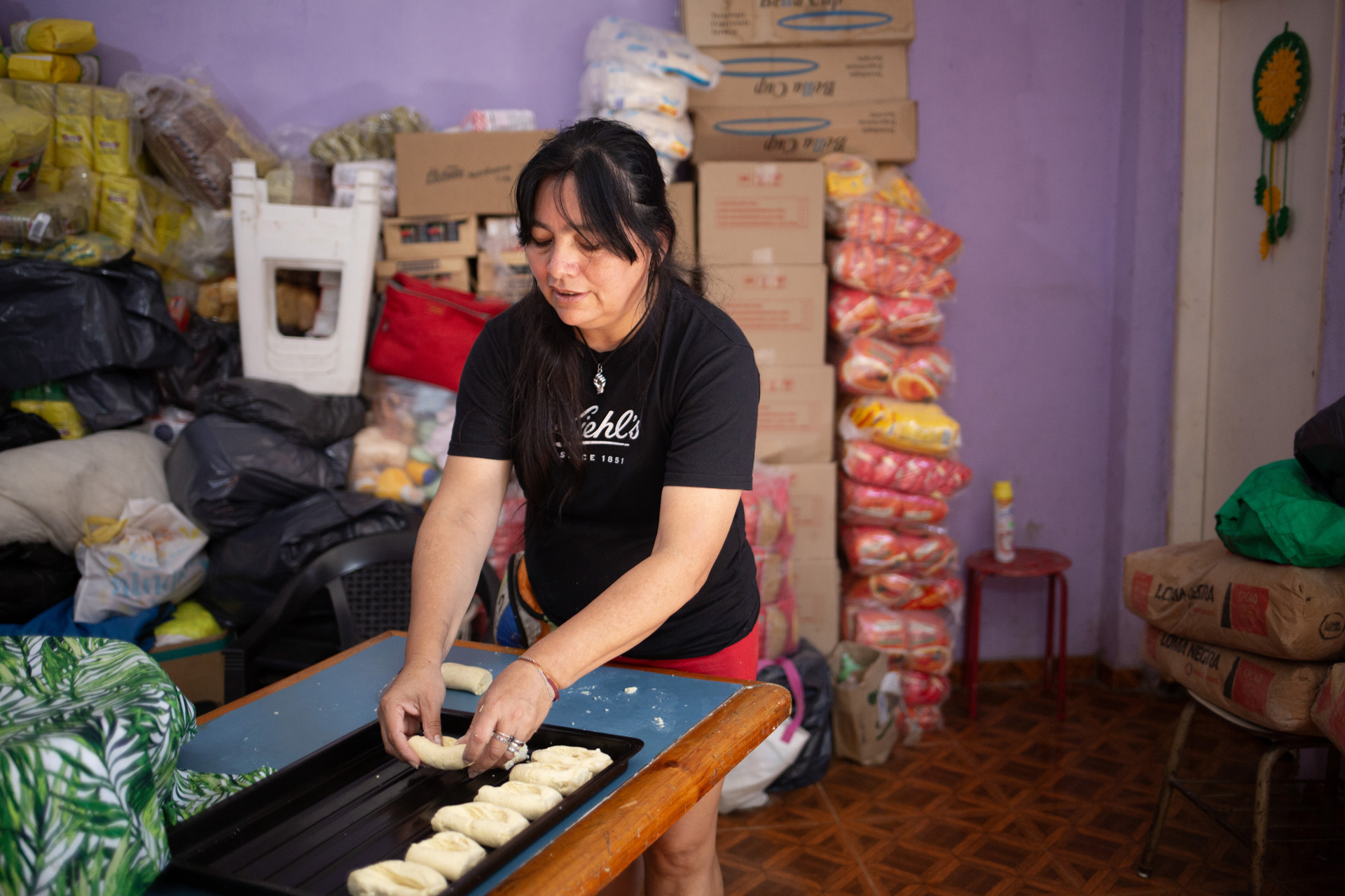 Su jornada se reparte entre sus roles de madre, cocinera comunitaria y trabajadora. La trama de su día se enreda con tareas que expanden las horas para que alcancen: servir la leche o cocinar parece un fragmento pequeño en el relato completo. Para que la comida esté disponible en la olla, antes hubo que buscarla ida y vuelta con el carro desde el merendero en el barrio San Blas hasta el otro lado de la Villa 21-24 en la zona sur de la ciudad de Buenos Aires, conseguir donaciones para sostener el espacio, mantener su limpieza, arreglar la humedad de la última inundación, y además, garantizar la propia subsistencia y el cuidado de la familia. Algunas organizaciones describen ese día eterno como una triple jornada laboral.