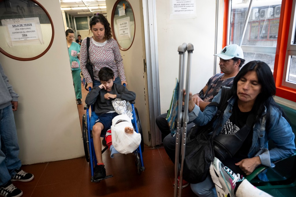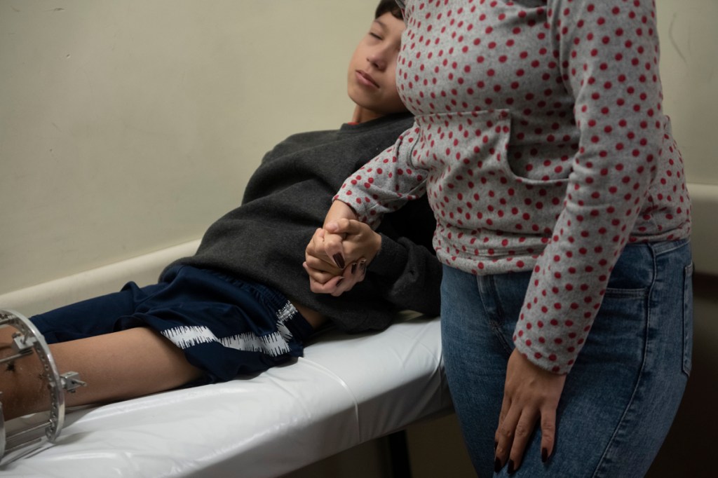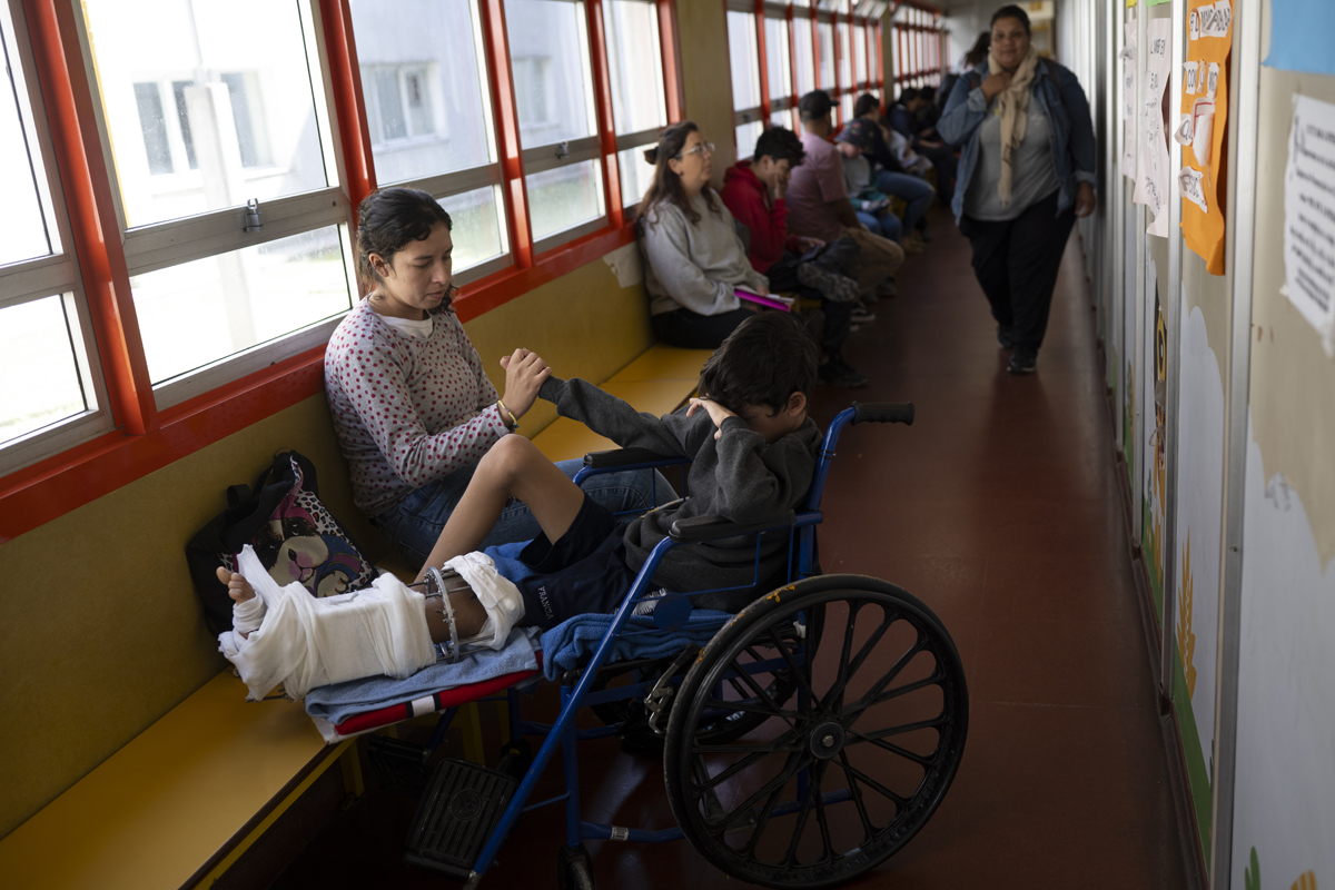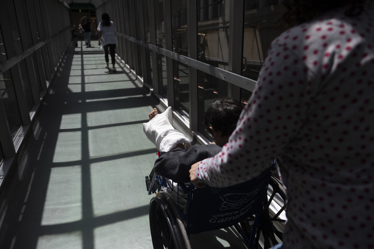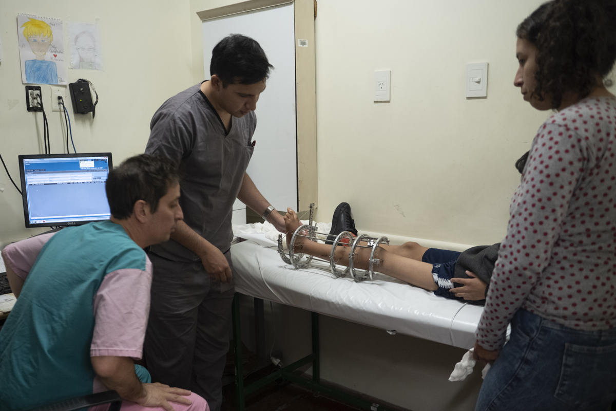 Los huesos del cuerpo humano tienen la capacidad de regenerarse creando tejido nuevo cuando hay un quiebre, y en la infancia el mismo crecimiento empuja el proceso. La osteotomía de elongación que recibió Santino implicó cortar el hueso en varias partes y separarlo para que alcance la longitud necesaria. El proceso lento, paciente y doloroso lo obligó a tener un tutor de 2,5 kg. en su pierna izquierda y durante los dos primeros meses no pudieron volver a Chaco. Alrededor del 40 por ciento de las internaciones del Garrahan son de pacientes que no residen en la ciudad de Buenos Aires ni el conurbano y se trasladan desde las distintas provincias del país. Desplazarse implica una decisión compleja desde lo económico y lo emocional, especialmente si las tareas de cuidado recaen exclusivamente sobre la madre. “Teníamos un miedo… no conozco nada acá. La mayoría de los que estamos acá no conocemos nada”, recuerda.