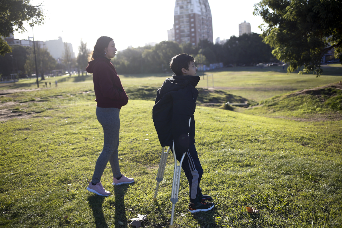 Marisol y Santino se suben al micro en la estación Retiro para regresar a Sáenz Peña, la segunda ciudad más importante de la provincia de Chaco, a 1100 kilómetros de distancia. Es el cuarto viaje que hacen juntos después de la cirugía que atravesó Santino en octubre de 2024 en el Hospital de Pediatría Garrahan que lo dejó durante cinco meses y medio en silla de ruedas. Viajaron en ambulancia, en avión, en remis, pero esta es la primera vez que Santino sonríe y camina con muletas a una velocidad que solo un niño de once años puede tener. Dice que ya aprendió cómo caerse para no golpearse. A su lado, Marisol acompaña firme para amortiguar lo que suceda.